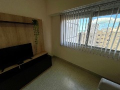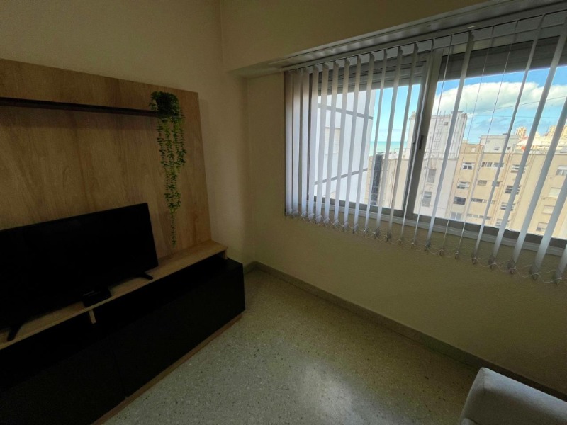 Living comedor con TV, sofá cama (para 1 adulto o 2 niños) y ventanal al contrafrente con pequeña vista al mar.