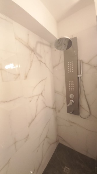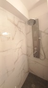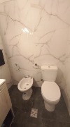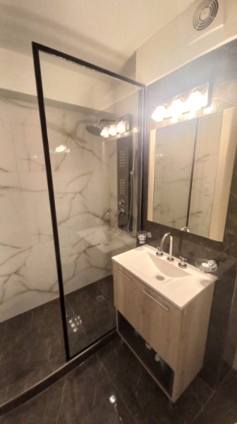 Baño completo con mampara corrediza de vidrio templado.