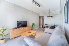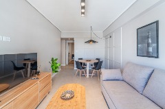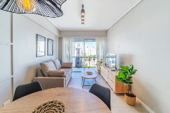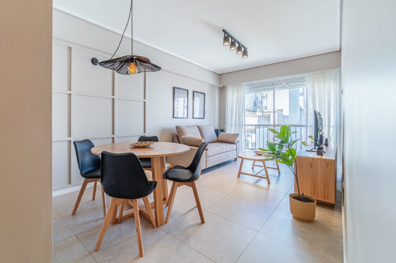 Living comedor al frente, con salida a balcón saliente y pequeña vista lateral al mar.