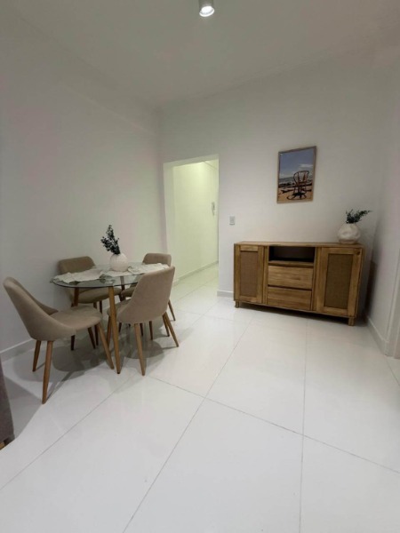 Al ingresar mediante hall de distribución, accedemos al amplio y cómodo living comedor con balcón salida a patio. TV de 43”. Sillón, mesa ratona, mueble para TV, mesa con 4 sillas, lámpara de pie, mueble de apoyo, cortinas Hunter Douglas. En el patio muebles de exterior