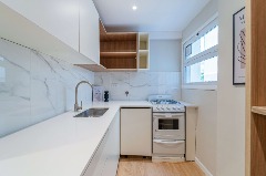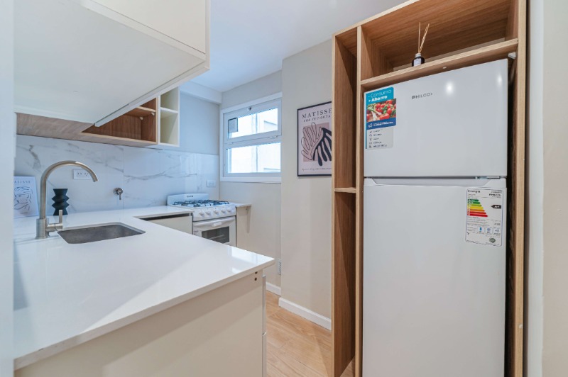 Cocina separada, completamente equipada con cocina a gas, heladera con freezer y buen espacio de guardado.