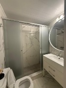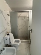 Baño completo con mampara de vidrio templado.