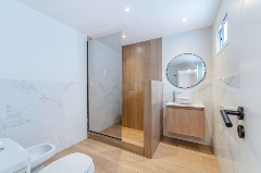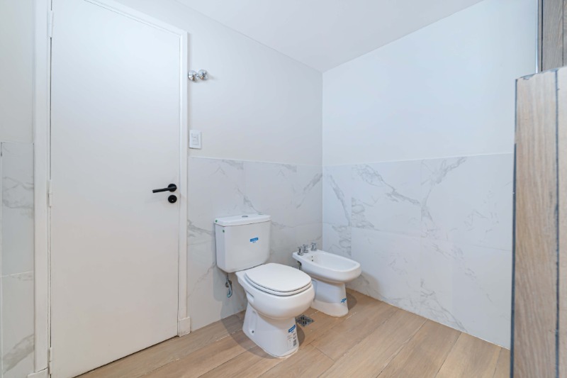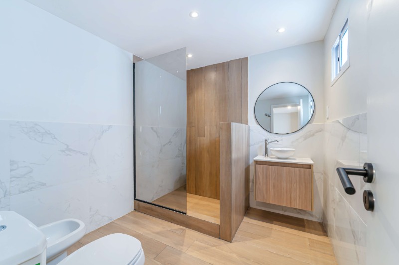 Baño completo con ducha y mampara, revestido en porcelanato de primera calidad.