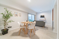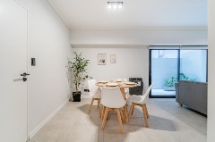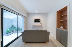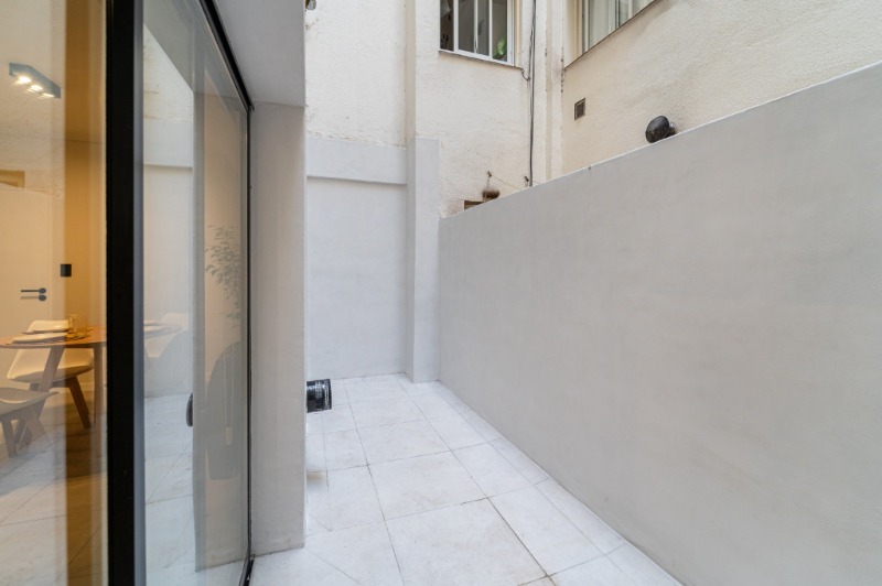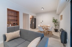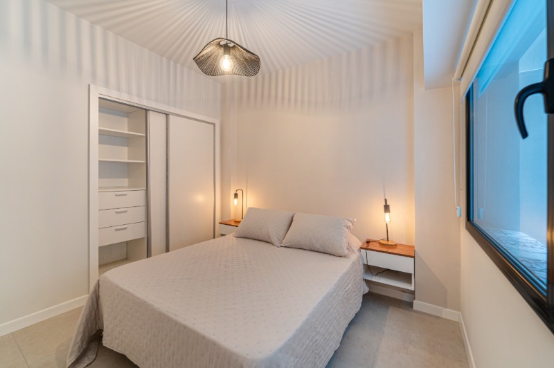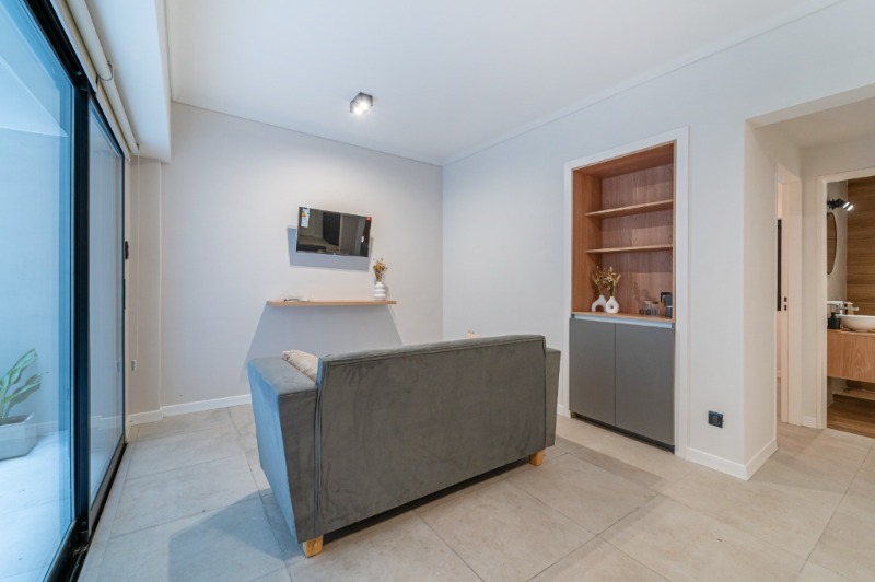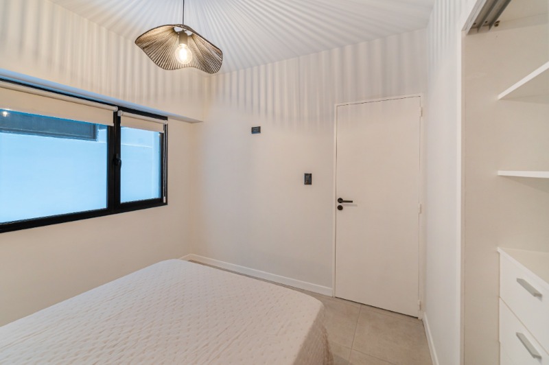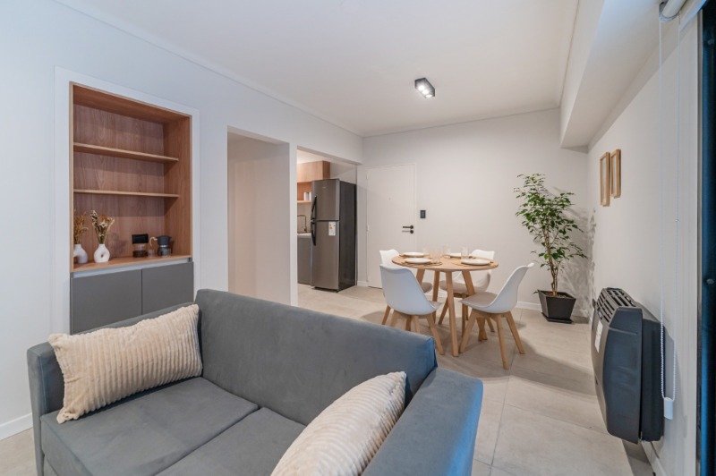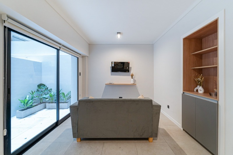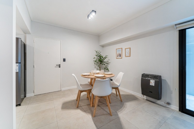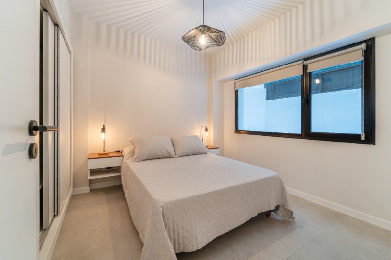 Ambiente dividido con amplio ventanal de piso a techo súper luminoso, cama sommier a estrenar de dos plazas, resplado de cama con mesas de luz incorporadas, mesa con 4 sillas a estrenar, rac con TV Smart 32 pulgadas nuevo, aire acondicionado frio calor, plantas, perchero de pie, cortinas, acolchado y decoración.