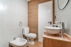 Baño completo con mampara, inodoro y bidet Ferrum línea Bari, vanitory madera blanca laqueado, griferia Piaza, secador de pelo (tipo hotel) y todo el equipamiento de baño.