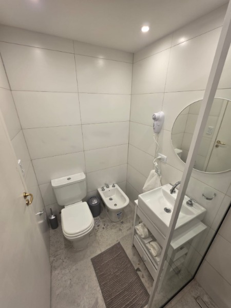 Baño completo con mampara, inodoro y bidet Ferrum línea Bari, vanitory madera blanca laqueado, griferia Piaza, secador de pelo (tipo hotel) y todo el equipamiento de baño.