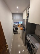 Ambiente dividido con amplio ventanal de piso a techo súper luminoso, cama sommier a estrenar de dos plazas, resplado de cama con mesas de luz incorporadas, mesa con 4 sillas a estrenar, rac con TV Smart 32 pulgadas nuevo, aire acondicionado frio calor, plantas, perchero de pie, cortinas, acolchado y decoración.