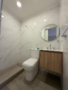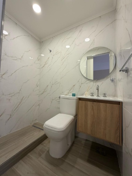 Baño principal, con mampara corrediza de vidrio templado.