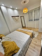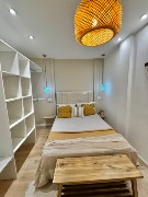 Ambiente dividido con amplio ventanal de piso a techo súper luminoso, cama sommier a estrenar de dos plazas, resplado de cama con mesas de luz incorporadas, mesa con 4 sillas a estrenar, rac con TV Smart 32 pulgadas nuevo, aire acondicionado frio calor, plantas, perchero de pie, cortinas, acolchado y decoración.