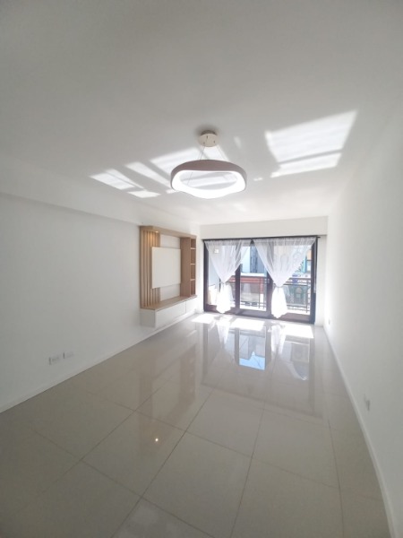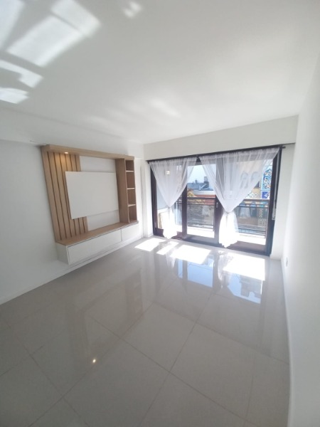 Living comedor externo, con pisos de porcelanato, rack a medida y cortinas a estrenar, con salida al balcón saliente muy luminoso.