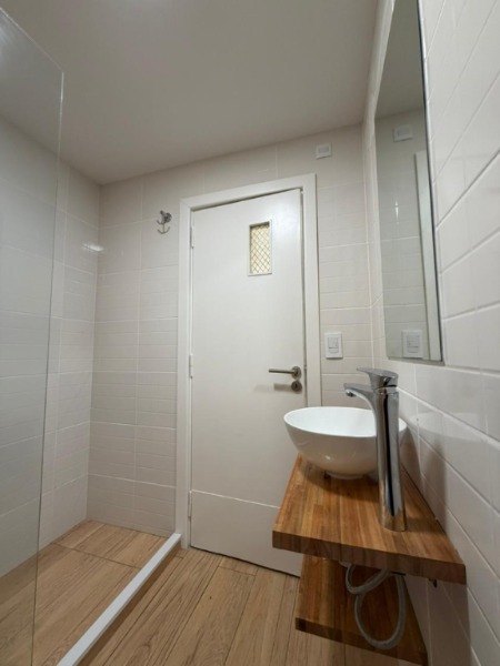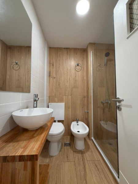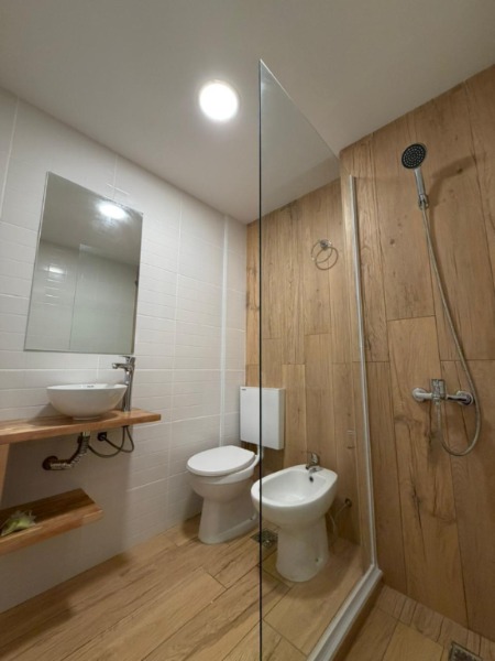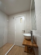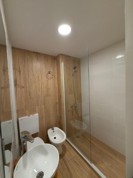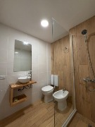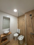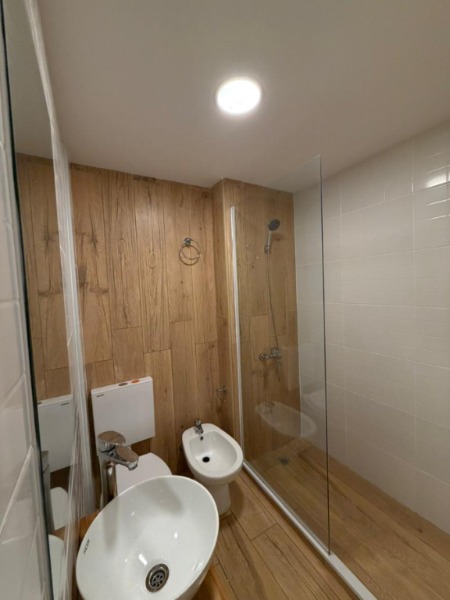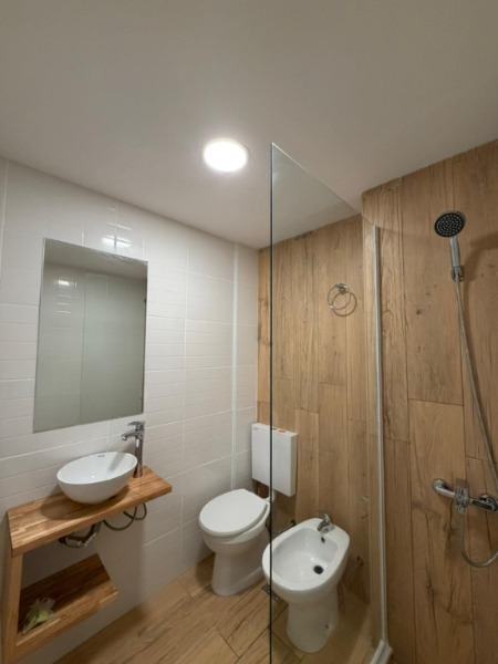 Baño completo con mampara corrediza de vidrio templado.