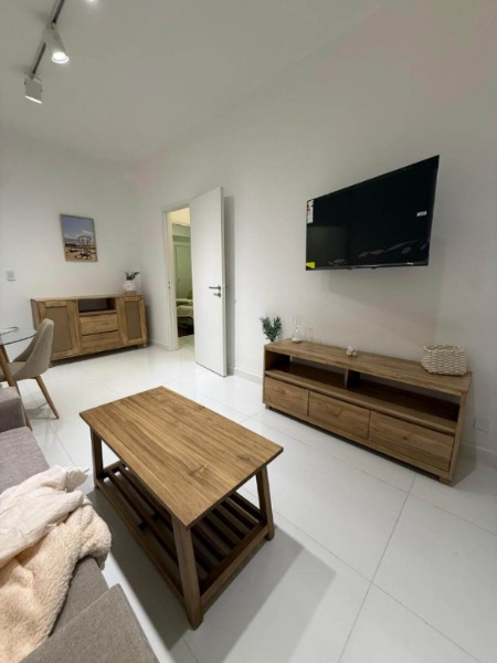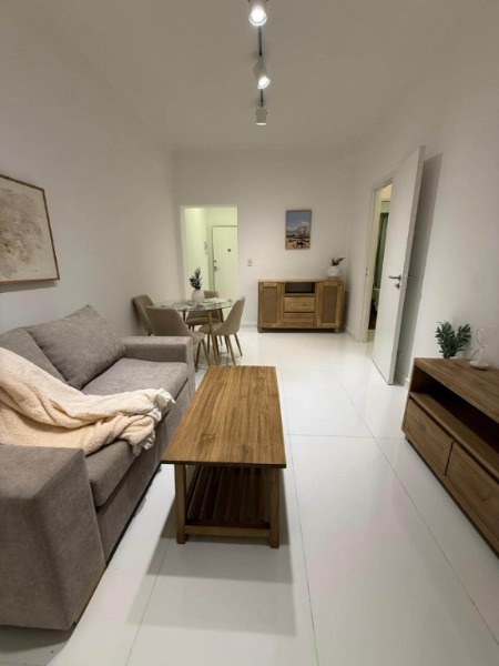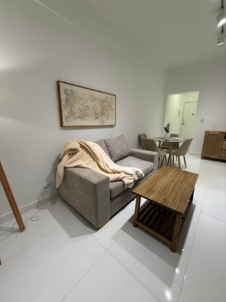 Al ingresar mediante hall de distribución, accedemos al amplio y cómodo living comedor con balcón salida a patio. TV de 43”. Sillón, mesa ratona, mueble para TV, mesa con 4 sillas, lámpara de pie, mueble de apoyo, cortinas Hunter Douglas. En el patio muebles de exterior