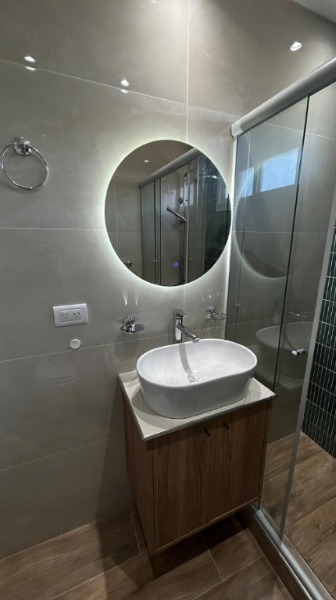 Baño principal, con mampara corrediza de vidrio templado.