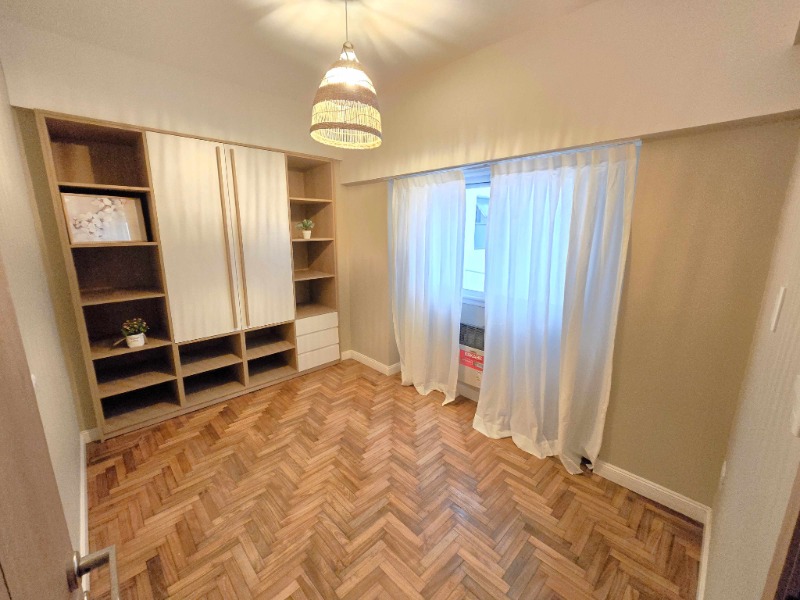 Dormitorio principal a la calle (3,2 x 3 m) con balcón privado, placard empotrado, split frío/calor y baño en suite revestido en porcelanato (2,2 x 1,5 m).