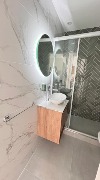 Baño principal con mampara corrediza de vidrio templado y espejo con luz LED.