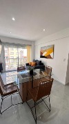 Living-comedor al frente con balcón, finamente decorado y amoblado con mesa, sillas, sillón, cuadro y mueble equipado con TV y puerto USB.