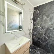 Baño moderno con ducha, revestimientos y griferías de diseño.
