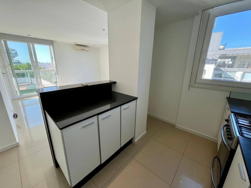 Cocina integrada con barra desayunadora, cómoda y con ventilación natural.