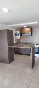 Cocina integrada, con termotanque eléctrico, cocina eléctrica y heladera con freezer.
