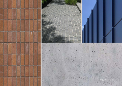Fachada con tejuelas de ladrillo, vigas y balcones en hormigón visto